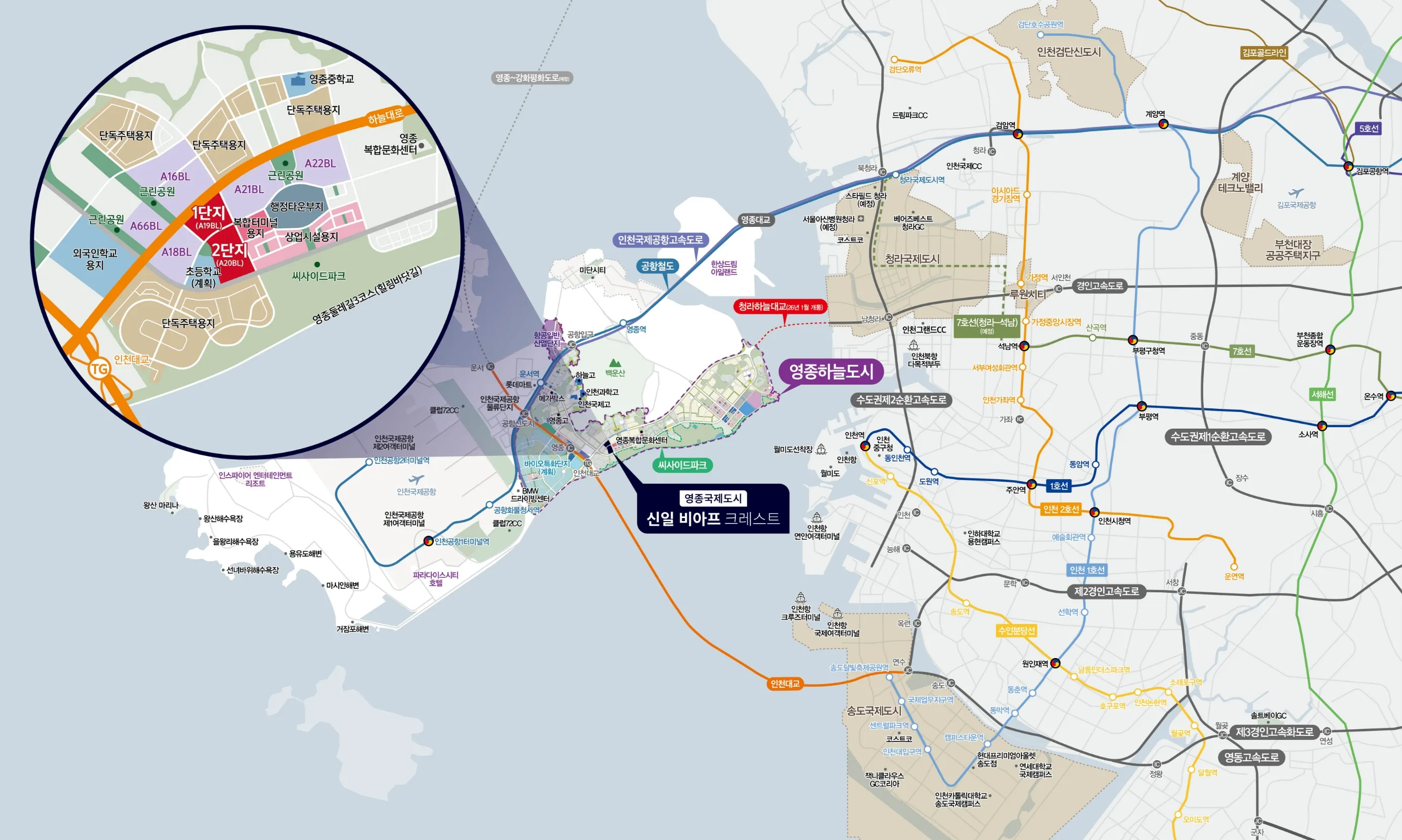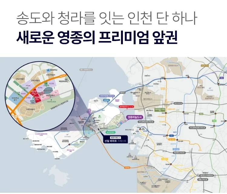 ※본 홈페이지에 표기된 지역명소와 생활인프라 및 각종 교통시설의 거리, 이동시간은 다음과 같습니다 (네이버지도 직선거리, 주행시 간) 영종IC 1.2km 차량 4분, 운서초954m 도보 14분, 씨사이드파크615m 도보 9분, 롯데마트 3km 차량 10분, 메가박스 2.4km 차량 8분, 제3유보지2.0km 차량 7분, 영종복합문화센터 1.1km 도보 15분, 백운산 1km 도보 15분, 영종대교 5.4km 차량 10분, 인천대교 900m 차량 2분, 인천하늘고 2.3km 차량 5분, 과학고 1.9km 차량 4분, 국제고1.7km 차량 4분 행정타운, 청라하늘대교 등 계획은 인천국제공항 5단계(계획)(‘25.07.22일 경향신문 기사 기준) 제2공항철도(계획) (‘25.08.07일 헤럴드경제기사 기준) 행정타운(계획)(25.02.18일 인천광역시청 보도자료 기준) 청라하늘대교(26년1월 개통)(25.11.11일 인천광역시경제자유구역청 보도자료 기준) GTX D,E(계획)(24.01.25일 인천광역시청 보도자료 기 준) 초등학교(계획)(인천광역시교육청-신설학교추진현황 기준, 주소:중구 운남동 1696-2) 영종구청(계획), 경찰서(계획)(25.03.05일 인천투데이 기사 기준) 바이오특화단지(계획)(25.11.10일 인천광역시 보도자료 기준)